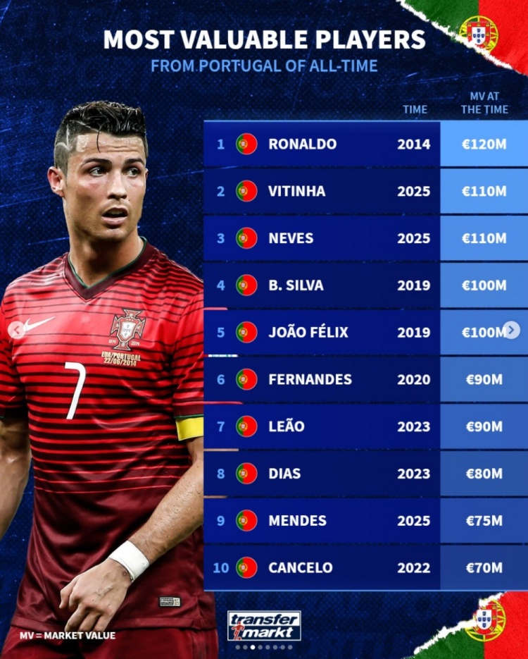 德转葡萄牙球员历史身价榜: